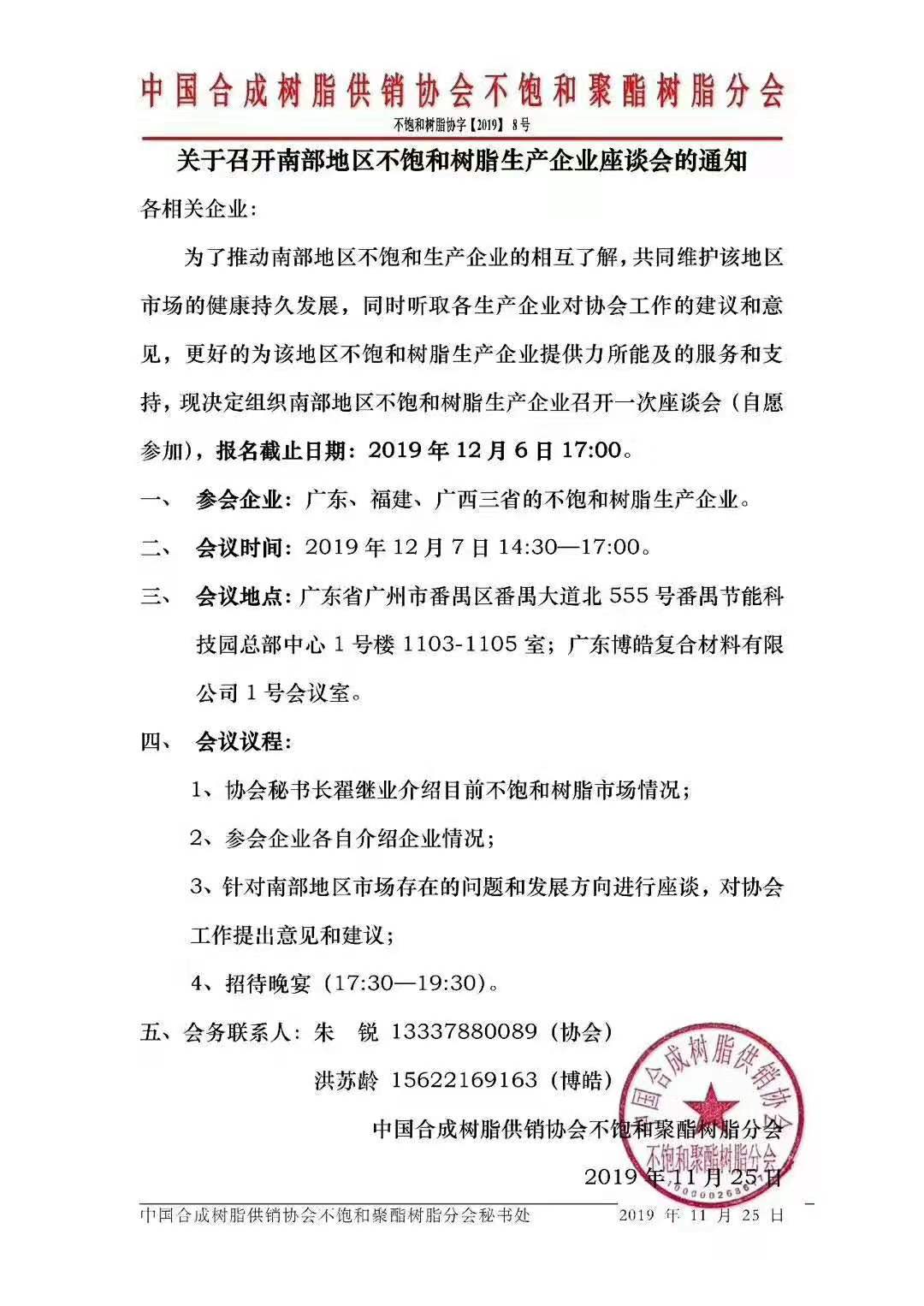 正文摘要:中國南部地區(qū)不飽和樹脂生產(chǎn)企業(yè)座談會將于2019年12月7日在廣東博皓復(fù)合材料有限公司召開! |