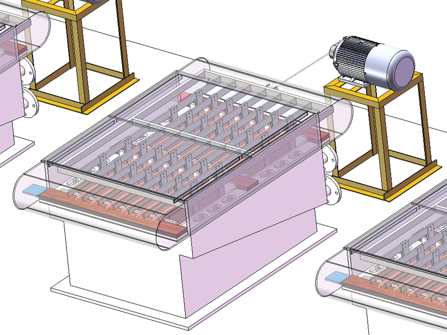 1)采用機械化的輸送帶出銀粉的方式,在陰極上析出的銀粉被刮落到槽底的機械輸送帶上,經過槽前段的斜坡結構,輸送出電解槽,直接落入運輸銀粉的車上,送去洗滌、鑄錠。減輕工人勞動強度。